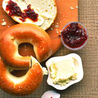 Bagel with Jam and Butter is a simple yet satisfying meal or snack that blends sweet and savory flavors. The bagel, traditionally a dense, ring-shaped bread originating from Jewish cuisine, provides a solid base rich in carbohydrates. Butter adds a creamy, indulgent layer with fats that offer energy, while the fruit-based jam contributes natural sweetness and a small dose of vitamins and antioxidants from the fruit content. Commonly enjoyed worldwide, this combination is popular for breakfast or as a quick bite. While it offers quick energy and a touch of nutrition, the butter is high in saturated fats, and many jams contain added sugars, which can make this choice less healthy when consumed in excess. Opting for whole-grain bagels, moderation in butter, and low-sugar jams can make this treat a more balanced option without sacrificing its delicious appeal.
