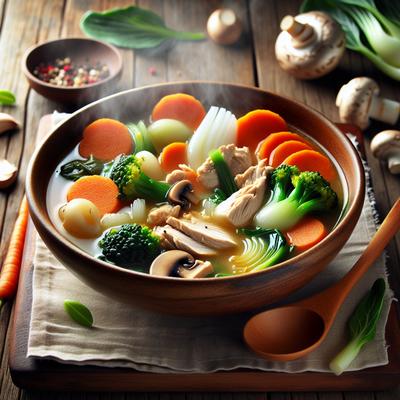 Warm up with a comforting bowl of Oriental Chicken Vegetable Soup, a delightful fusion of bold Asian flavors and nutritious ingredients. Tender bites of chicken thigh, vibrant bok choy, and earthy shiitake mushrooms swim in a savory broth infused with ginger, garlic, soy sauce, and sesame oil. This wholesome soup is rounded out with julienned carrots and silky rice noodles, creating a harmonious balance of textures and flavors. Topped with fresh scallions and cilantro, it delivers an aromatic finish that’s both refreshing and satisfying. Ready in just 45 minutes, this one-pot, low-prep recipe is perfect for weeknight dinners or a cozy lunch. Enjoy a heartwarming dish that’s not only flavorful but also packed with wholesome vegetables—a must-try for fans of Asian-inspired soups!